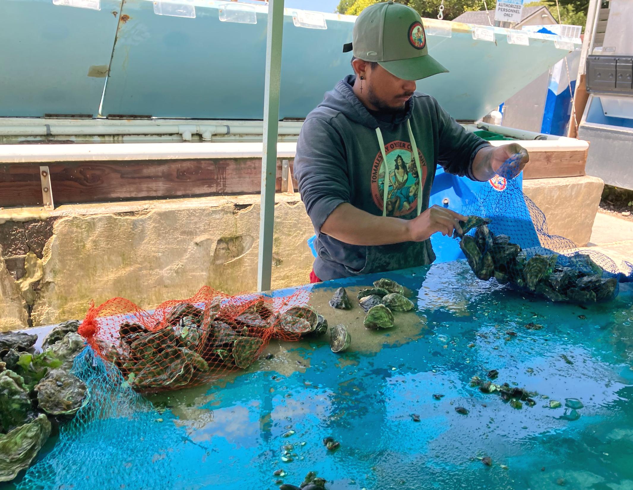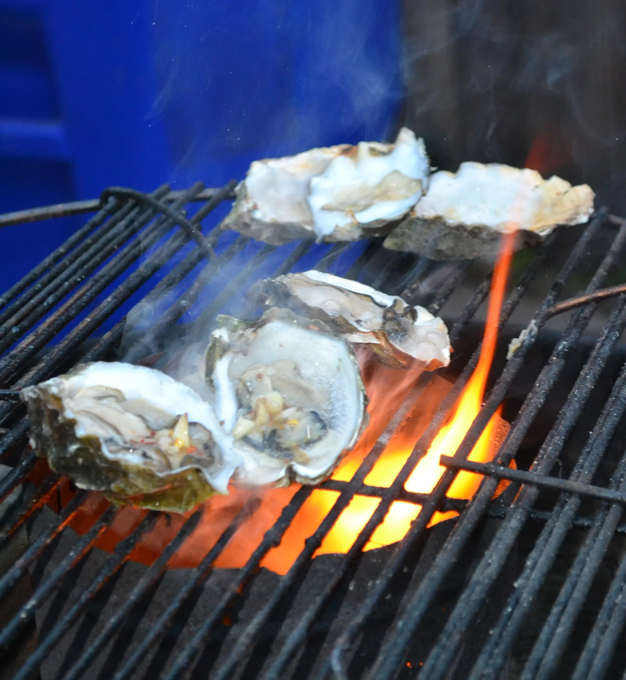 Under a large canopy, workers moved with relentless precision. Grabbing bags and heaving up glistening oysters onto the large outdoor table. Each bag landed on the counter with a wet, satisfying thud before being passed to the next eager set of hands. When our turn came, we chose a some for slurping raw and some destined for the grill.