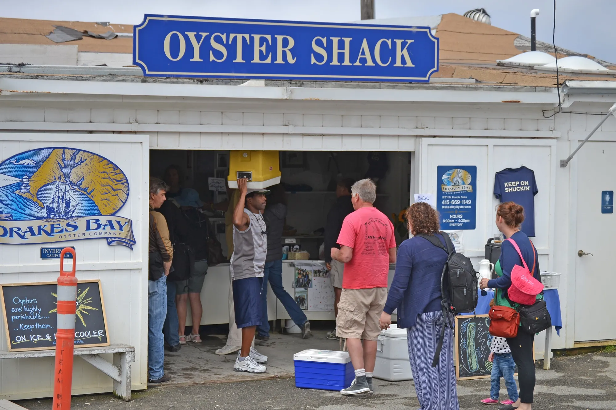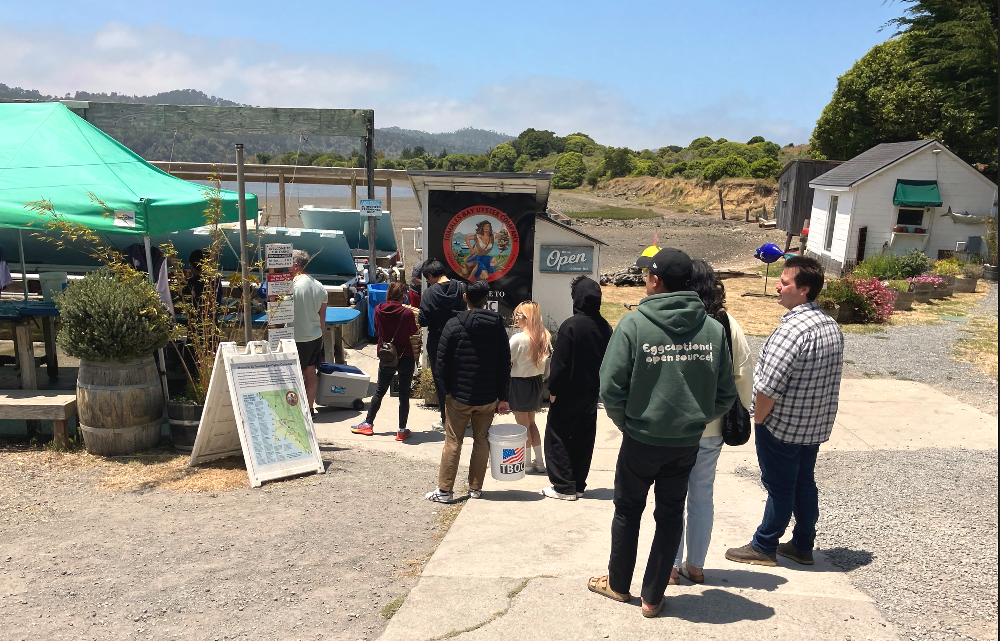 The torch, however, still burns in Marshall, where Tomales Bay Oyster Company operates. By the time we arrived, the gravel lot was overflowing with Subarus, pickups, and coolers. The line of oyster pilgrims spilled toward the water, a congregation united by saltwater cravings.
