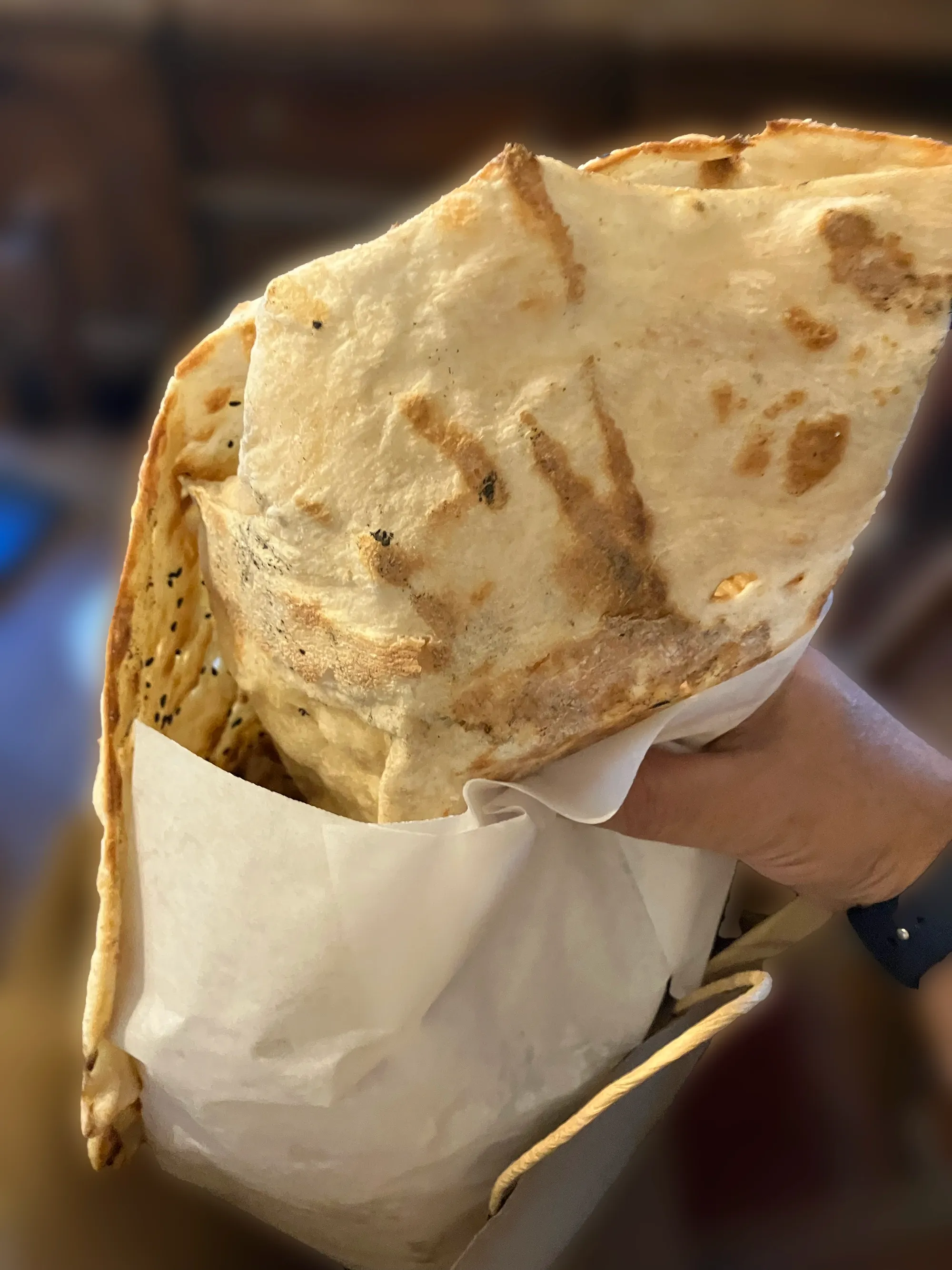 Rashoosh bread is cooked hot, so it develops a crispy, cracker-like texture in parts while remaining pliable enough to use for scooping. Brushed with butter, sprinkled with black sesame seeds, it was also delicious.